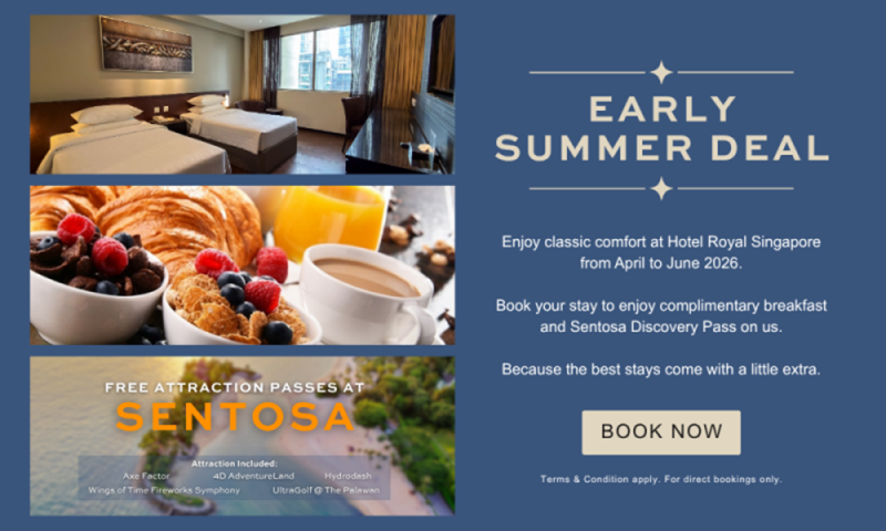 Enjoy classic comfort at our hotel from now until June 30, 2026. Book your stay with us to enjoy complimentary breakfast and a Sentosa Discovery Pass on us.*Terms & Conditions apply and applicable for DIRECT booking on hotel website only.